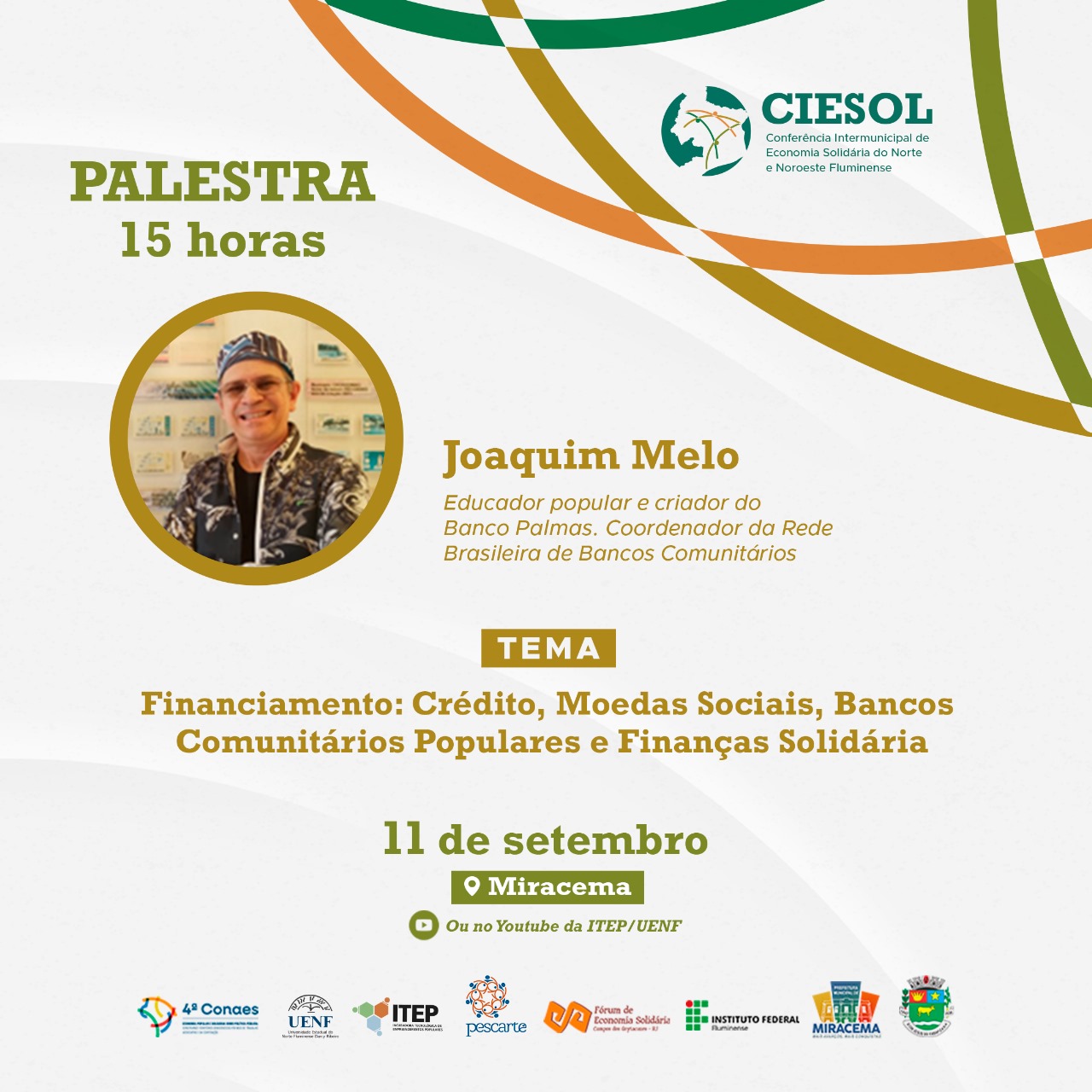 Com o tema “Financiamento: Crédito, Moedas Sociais, Bancos Comunitários Populares e Finanças Solidárias”, Joaquim Melo falou na CIESOL sobre a fundação do Banco Palmas. “Foi a primeira moeda social do Brasil, a gente não tinha os conceitos de finança solidária, mas tínhamos a certeza, através do processo colaborativo, que seria possível resolver nossos problemas. Nós queríamos abrir o nosso sistema econômico”, declarou o educador popular.