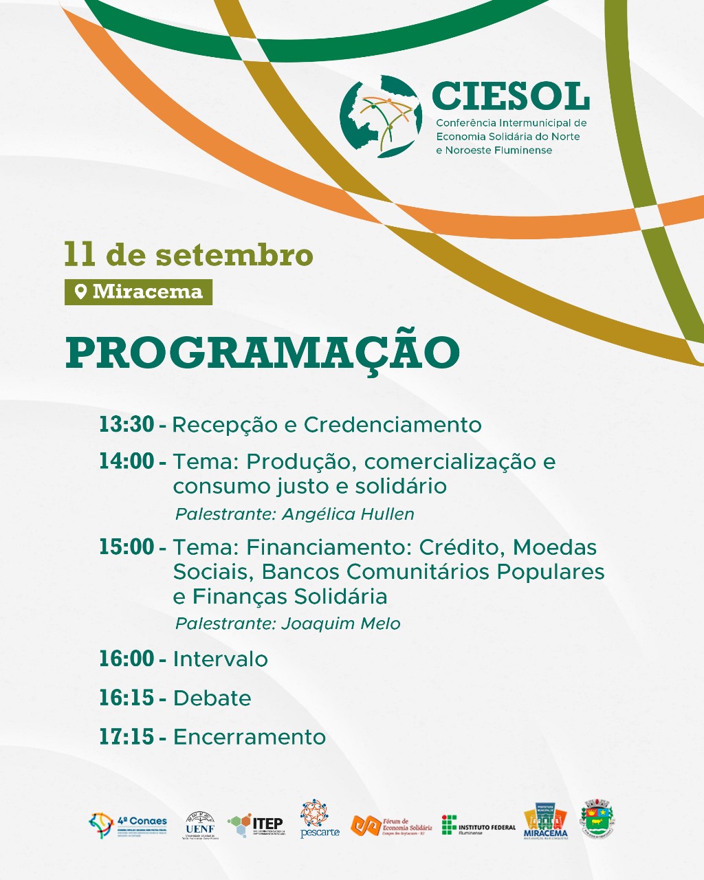 A CIESOL (Conferência Intermunicipal de Economia Solidária do Norte e Noroeste Fluminense) teve início no dia 11 de setembro (quarta-feira) na Previ Miracema, noroeste fluminense. Mediados pela integrante da coordenação da CIESOL, Nilza Franco, os conferencistas convidados: Angélica Hullen, secretária de assistência social e habitação de Bom Jesus do Itabapoana e Joaquim Melo, coordenador da Rede Brasileira de Bancos Comunitários, ressaltaram a importância da possibilidade de geração ao trabalho e renda aos cidadãos. O canal da ITEP/UENF no YouTube transmitiu o evento.