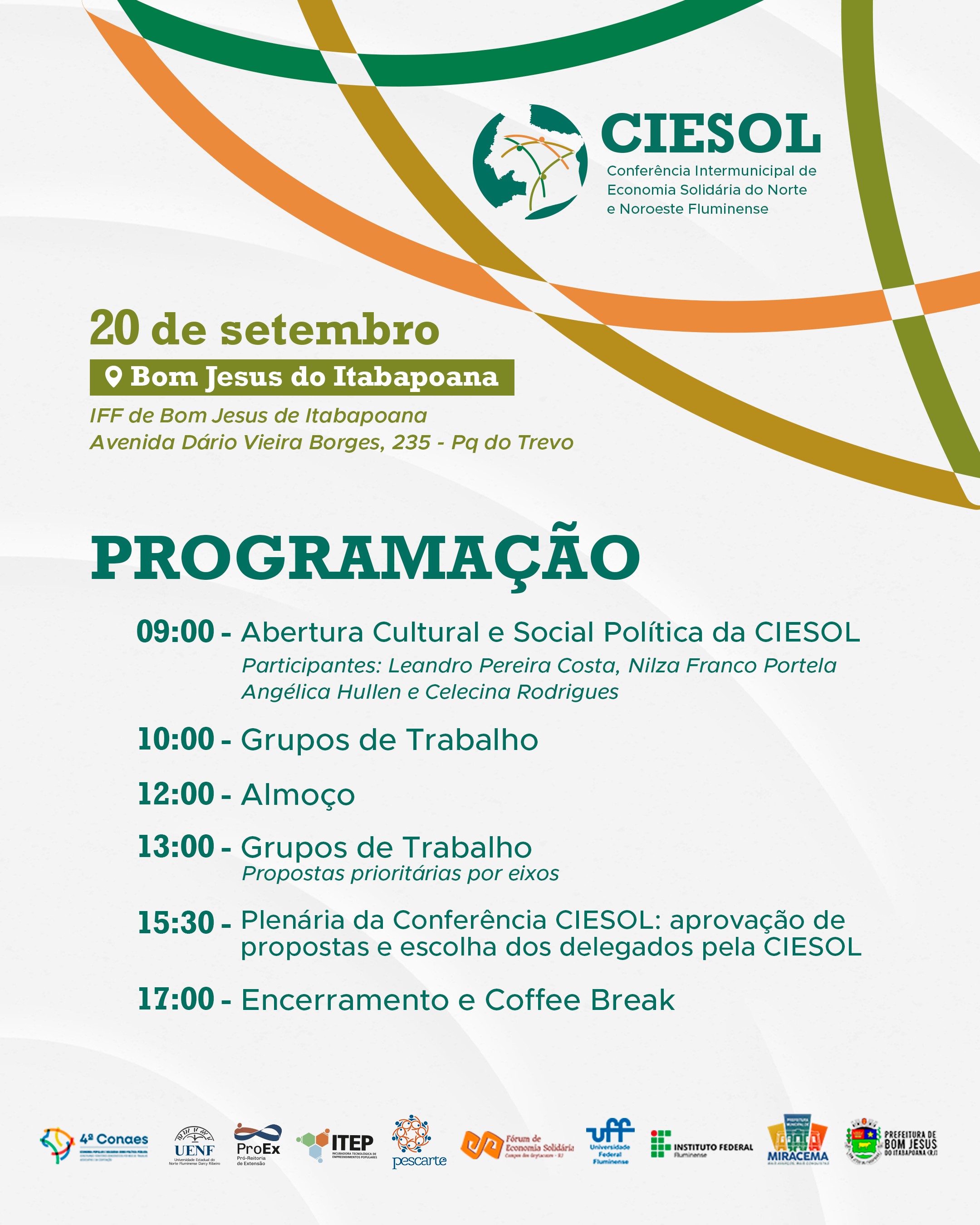 Além da ITEP/UENF, a CIESOL teve como parceiros o Fórum de Economia Solidária, PROEX, Pescarte, UENF, IFF, UFF, Prefeitura de Miracema e Prefeitura de Bom Jesus do Itabapoana.